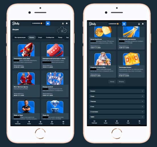 Stake Casino — это полностью адаптивная платформа: все функции доступны через браузер на любом устройстве. Нельзя скачать специальное приложение, но браузерная версия оптимизирована для смартфонов и планшетов.